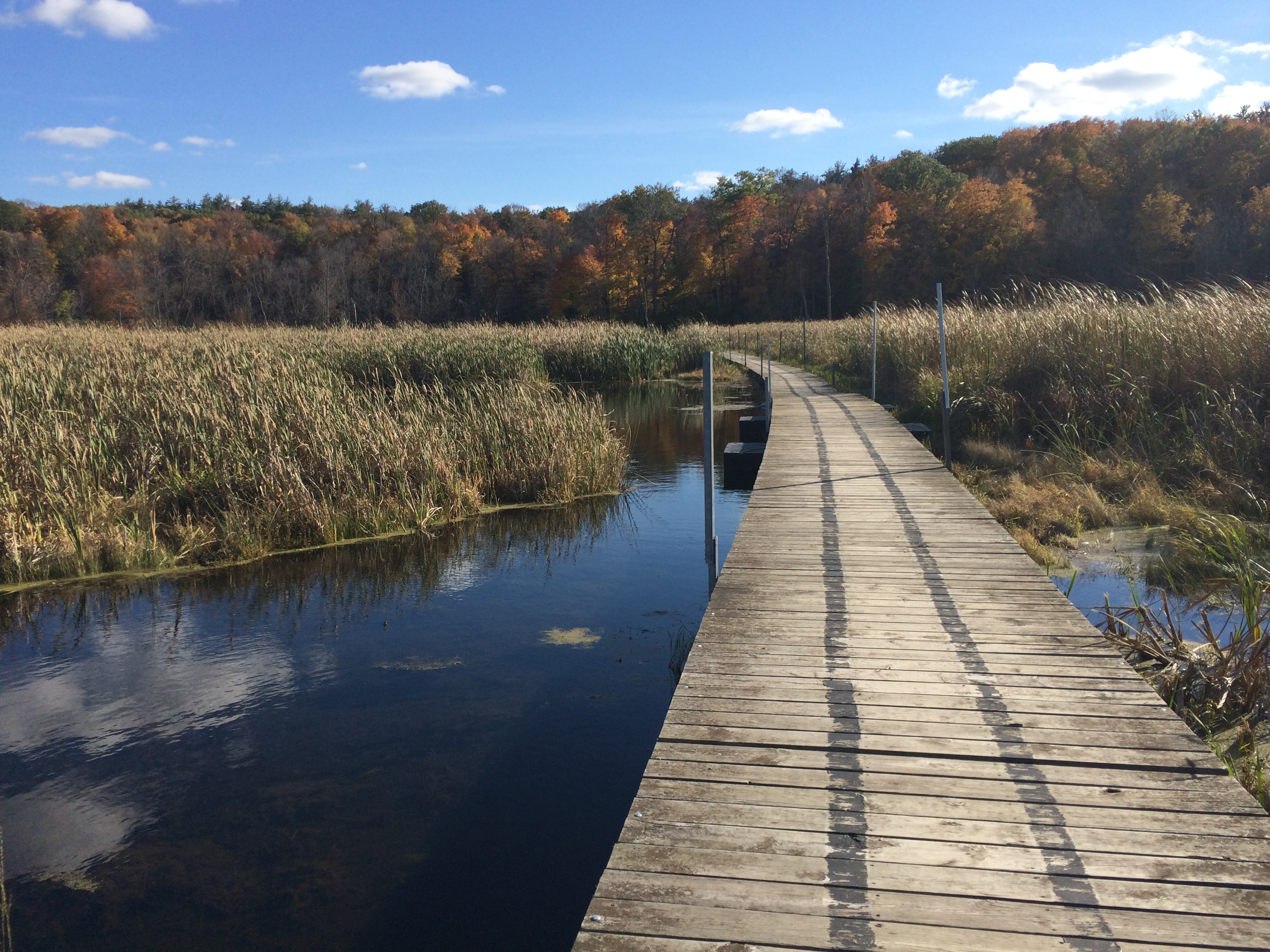 If you continue on the gravel trail, you will eventually come to a wooden sign that says “Observation Deck” that, if you follow, will point you down a wooden boardwalk that cuts through a marsh. Once past the boardwalk, follow the trail straight for a few steps and you will see a large observation deck to the northeast, which overlooks a wetland- usually filled with various species of birds.